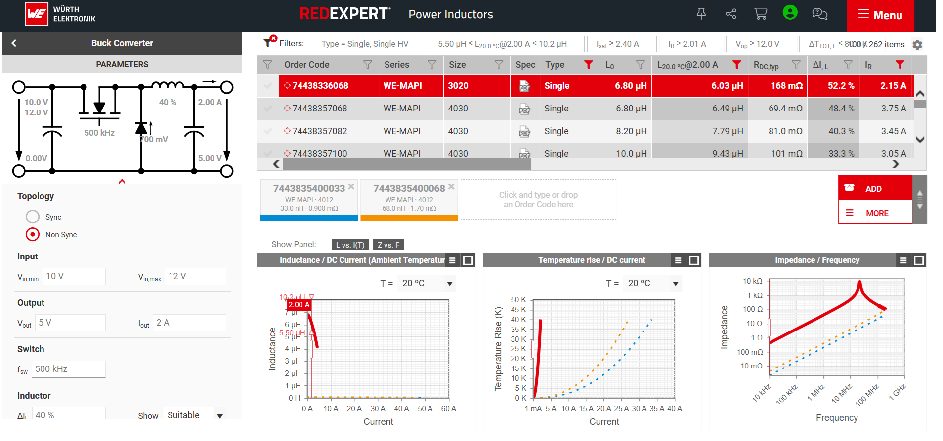 「必須」と「望ましい」の目標のバランスを取ることは、変数の数と、その変数の相互作用が非線形であることが多いことから、困難な作業になる場合があります。そこで、Würth ElektronikのREDEXPERTツールが、設計者に実行可能な選択肢を示しながら、時間を節約します。REDEXPERT は、WE-MAPI シリーズインダクタの AC およびDC損失のモデリング、最適なインダクタの選択などを容易にします(図 1)。[1]