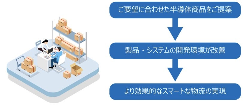 ロームは、物流現場との密なコミュニケーションを図り、要望や問題点を共有することで、ご要望に合わせたセンシングソリューションやその他の半導体ソリューションをご提案。より効果的なスマート物流の実現に貢献します。