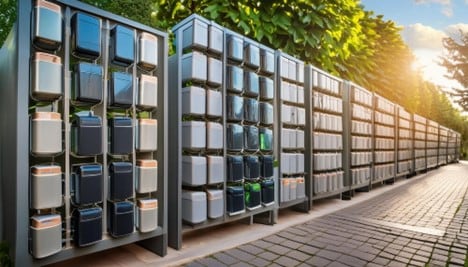 図3:充電壁に設置された充電済みのバッテリと交換できる電動スクーター用バッテリのレンダリング図。(出典: Generated by AI).