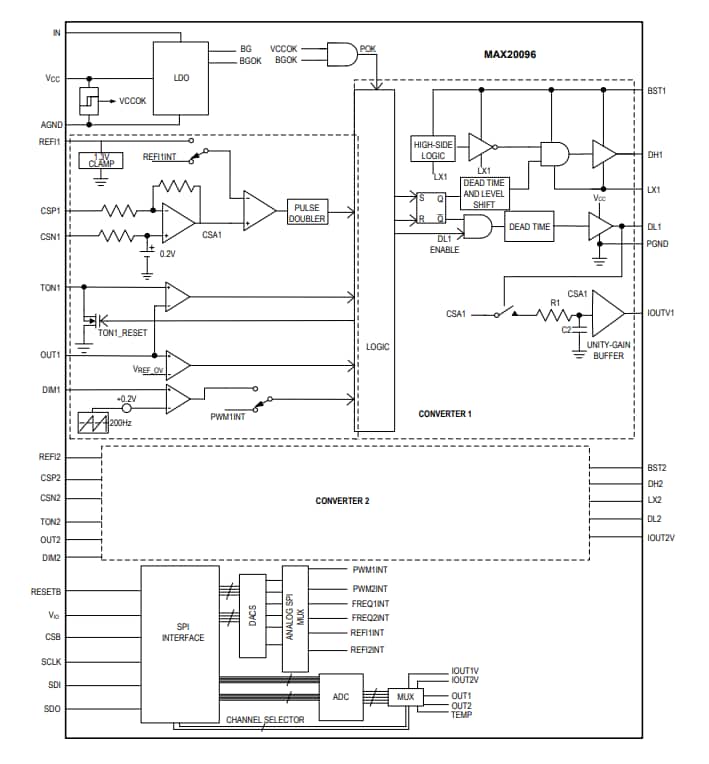 下側スイッチングデバイスで電流をセンシングすることによって、インダクタ電流のセンシングを達成できます。ICには、2つの完全同期バックコンバータコントローラが集積されており、高周波動作用に設計されていて、最高1MHzまでのスイッチング周波数で動作します。SPIインターフェイスは、両方のチャンネルで出力電圧と電流を読み戻すだけでなく、接合部温度も読み戻します。インダクタ電流制限保護、過電圧保護、熱上昇シャットダウンといった数多くの保護機能が搭載されています。