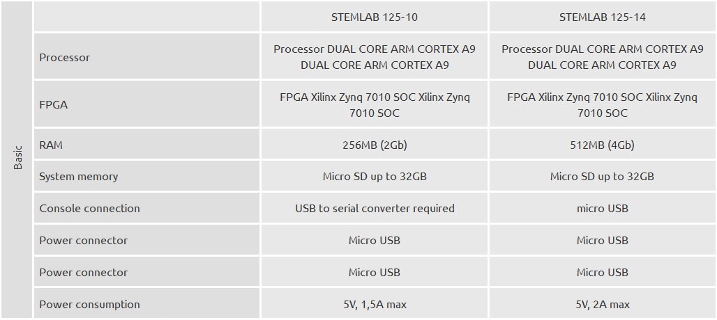STEMLabボードは、STEMLab 125-10および125-14の2バージョンでご用意があります。 どちらにも、同じ特徴および機能が備わっており、違いは高周波入力と出力の技術仕様です。 このボードは、異なるグループおよび/またはニーズをターゲットとするように設計されています。 STEMLab 14には、プロ環境での高精度な測定結果を目的とした、14ビット入力/出力チャンネルがあります。 STEMLab 10には、10ビット入力/出力チャンネルがあり、大学、学生、メーカーに最適です。 他の相違点は以下の通りです。