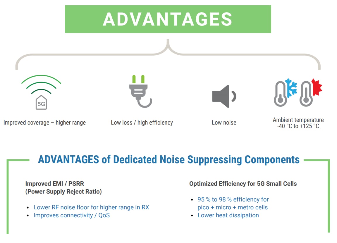 Vishay 5G電源ソリューションは、5G mmWave基地局アプリケーションを対象とした最高レベルの効率性とRFノイズレベルが備わっているデバイスのポートフォリオです。これらには、-40°C~+125°Cの高動作温度範囲があります。ワイドバンド・フィルタリングは、超低ESRフィルタコンデンサを使用して達成できます。また、ソフトリカバリダイオードによって、PSRRおよびRFノイズフロアが改善されます。